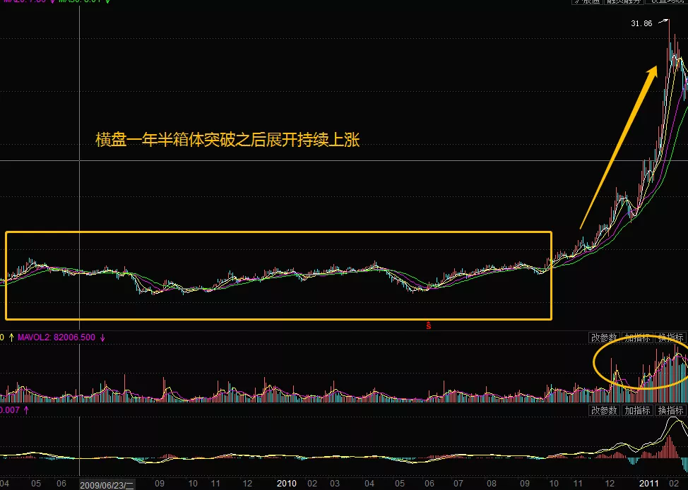 比如在2011年的证券市场上,高铁、水利、机械、新能源、稀土永磁等热点板块陆续受到追捧,股票价格也逐渐变的强劲突出。其中,晋亿实业就成为了市场上最大的黑马,从下图可以看出,股票价格通过底部一年半之久的箱体构筑,最终在政策面、行业基本面以及资金面的共同配合下实现了拉升趋势,2010年10月至2011年1月保持了四个月,最高股票价格达到了31.86元!